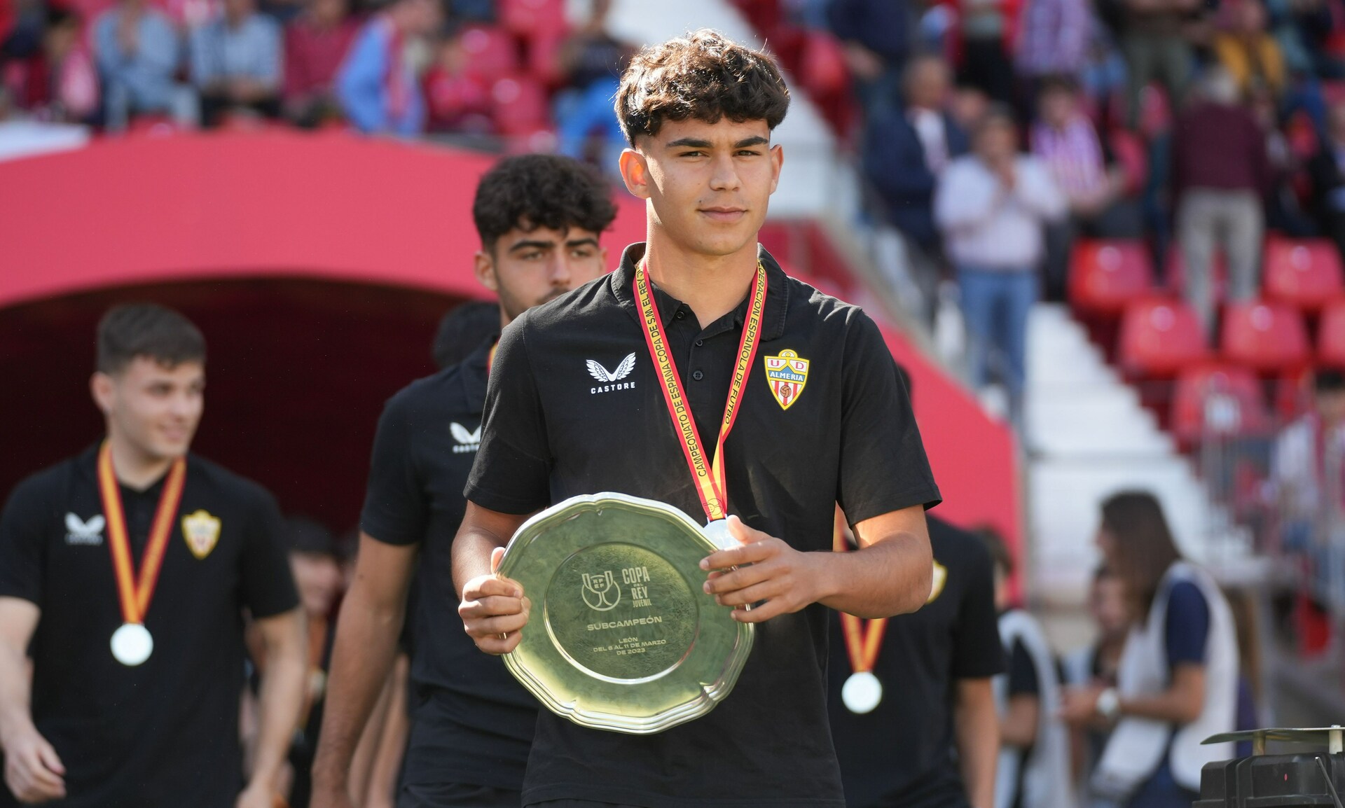 El capitán del equipo con el trofeo que acredita al Almería juvenil A como subcampeón de la Copa del Rey.